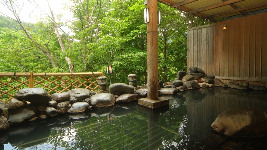 源泉掛け流しの効能豊かな温泉と窓の外に広がる渓流の風景が自慢の浴場。男女共に渓谷に面した露天風呂、そして75℃の源泉から生まれる湯けむりを利用した蒸し風呂を設け、朝、夕で両方のお風呂を楽しむことができる。源泉かけ流しの日帰り温泉とランチセットプランがあります。