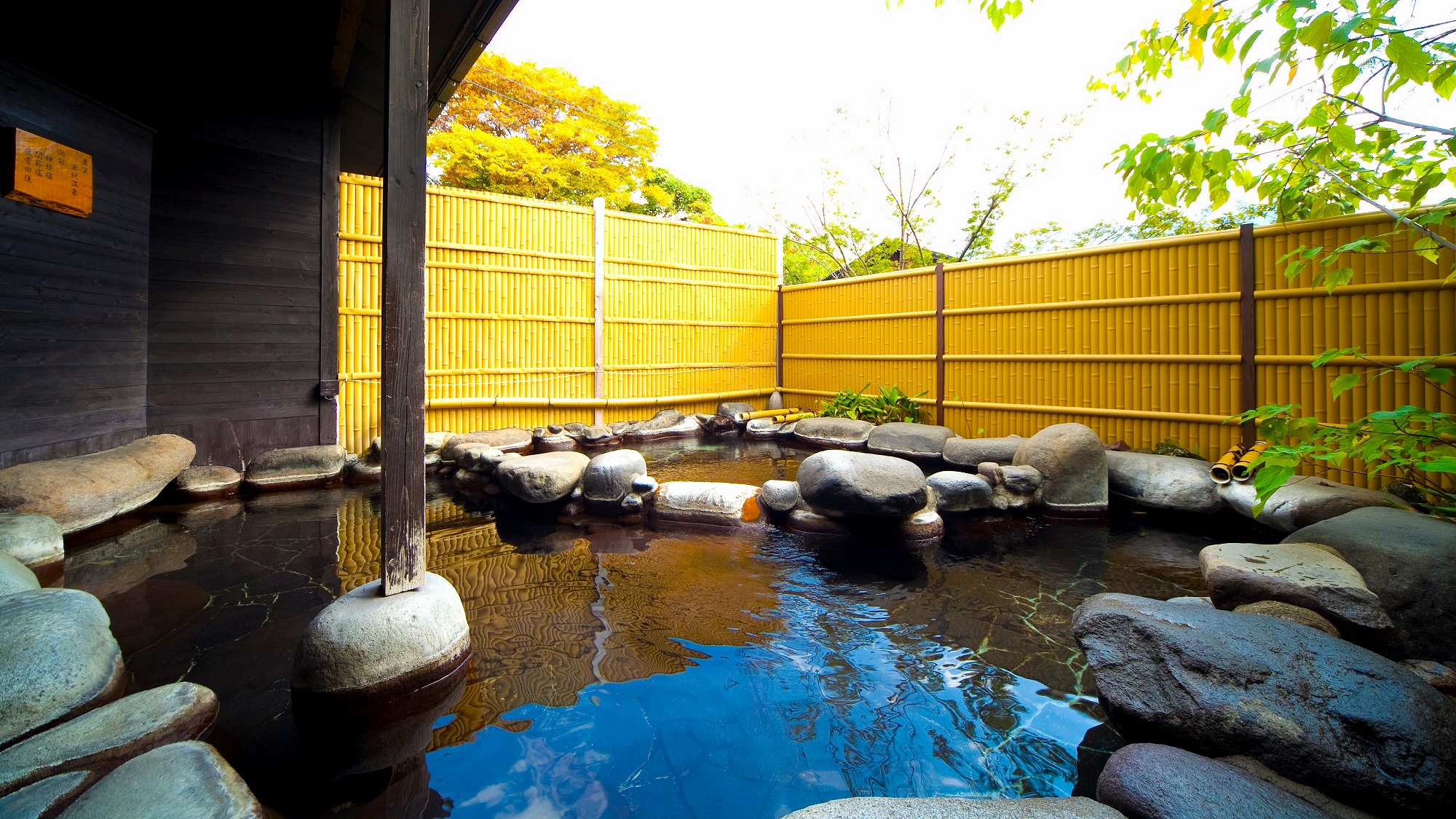 男女別の露天風呂は、仙人がひょっこりと現れそうな幻想的な雰囲気。お食事処の個室にて、和牛ステーキ会席に舌鼓!タオルやアメニティもご準備しておりますので、お気軽に。