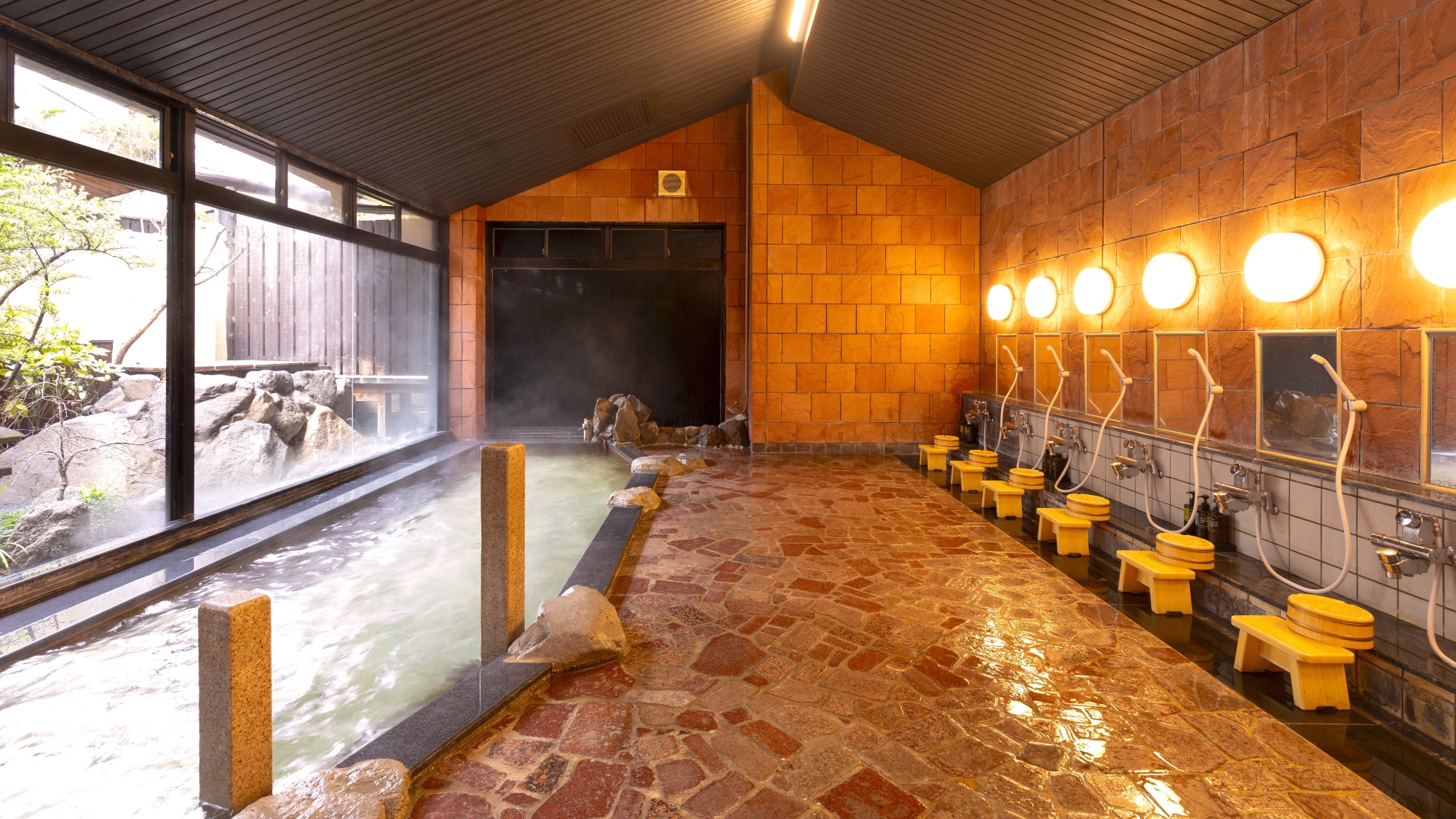 男女別の大浴場と露天風呂、5カ所ある貸切の家族風呂は、滞在中は無料でご入浴できます。女性人気No1!その名の通りかわいらしい緑がかった陶器製の浴槽の家族風呂。 なめらかな泉質を目でもお楽しみいただきながらご入浴いただけます。