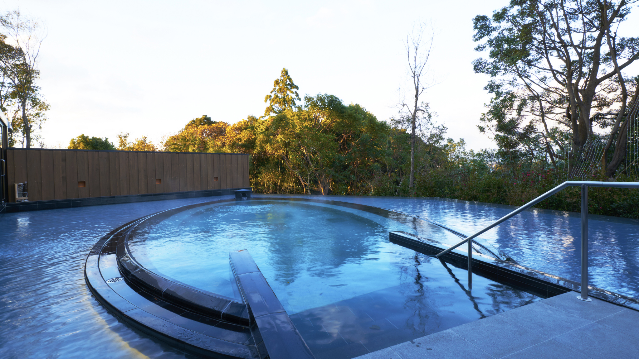 名湯「白浜温泉」の中でも群を抜く良質な湯の自社源泉「若葉温泉」。一面に広がる水盤に大きく張り出し、まるで水に浮かんでいるような感覚となる露天風呂。夜はイルミネーションの光に包まれ、幻想的でロマンチックな雰囲気となります。プールと癒しの空間リビングラウンジでは、夜にはナイトプールも楽しめます。