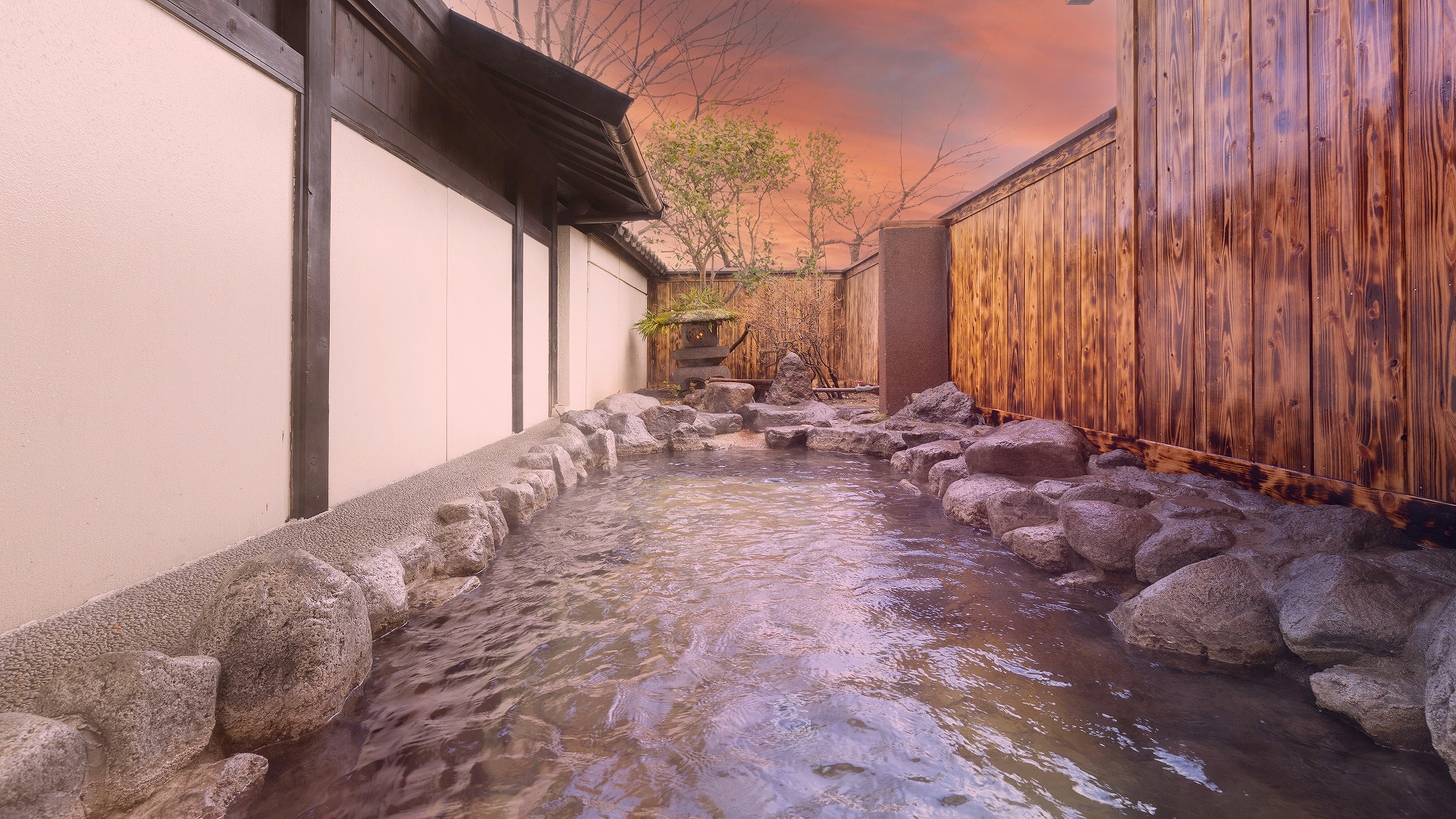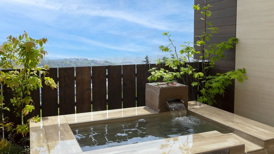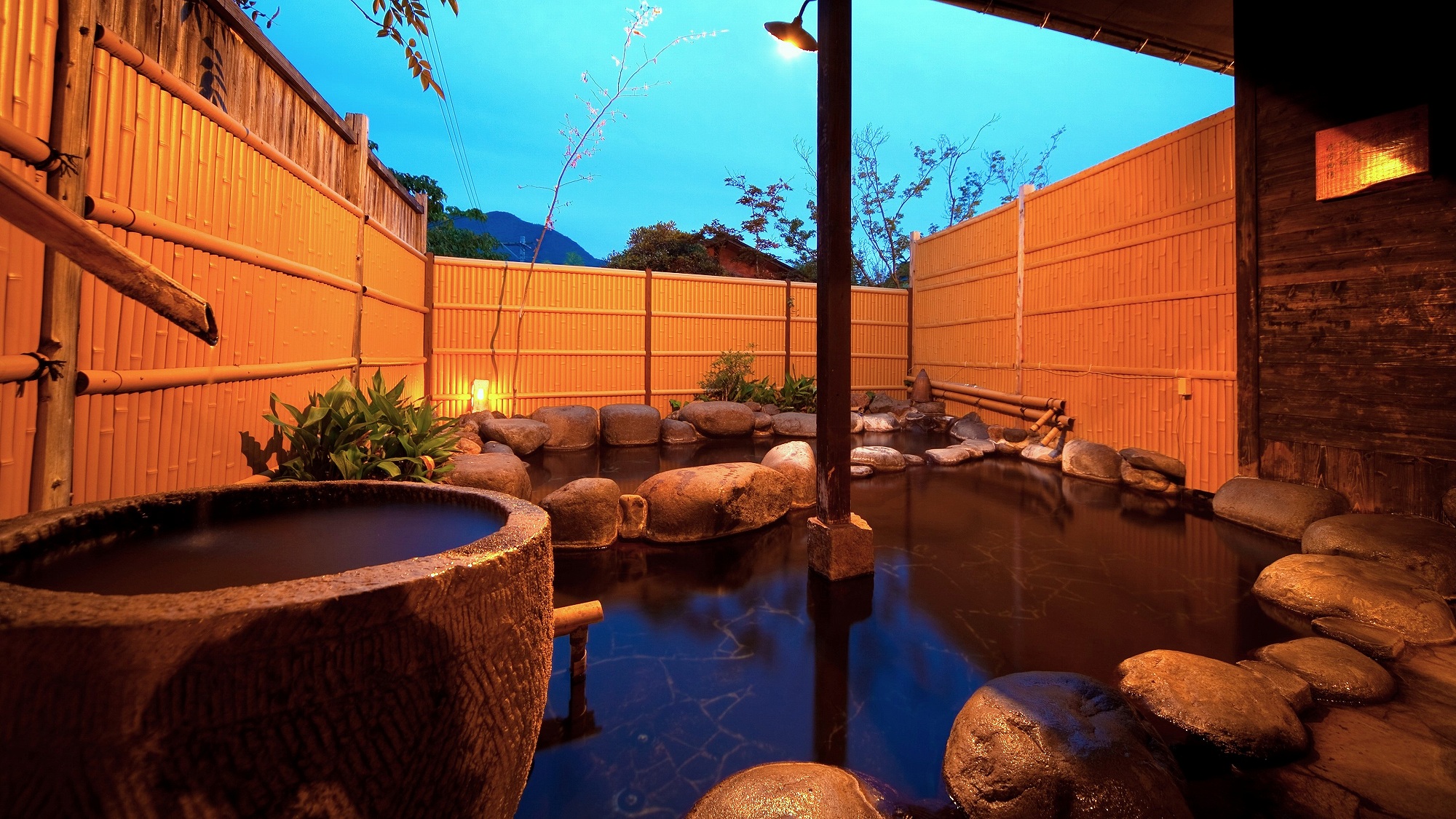 すべての客室には内風呂もしくは半露天風呂が付いており、お好きな時に温泉に入れます。露天風呂も男女各1つずつあり、いつでも入浴可能。日帰りプランでは、おおいた和牛と地鶏の炭火焼きコース&大分名物のとり天が味わえます。