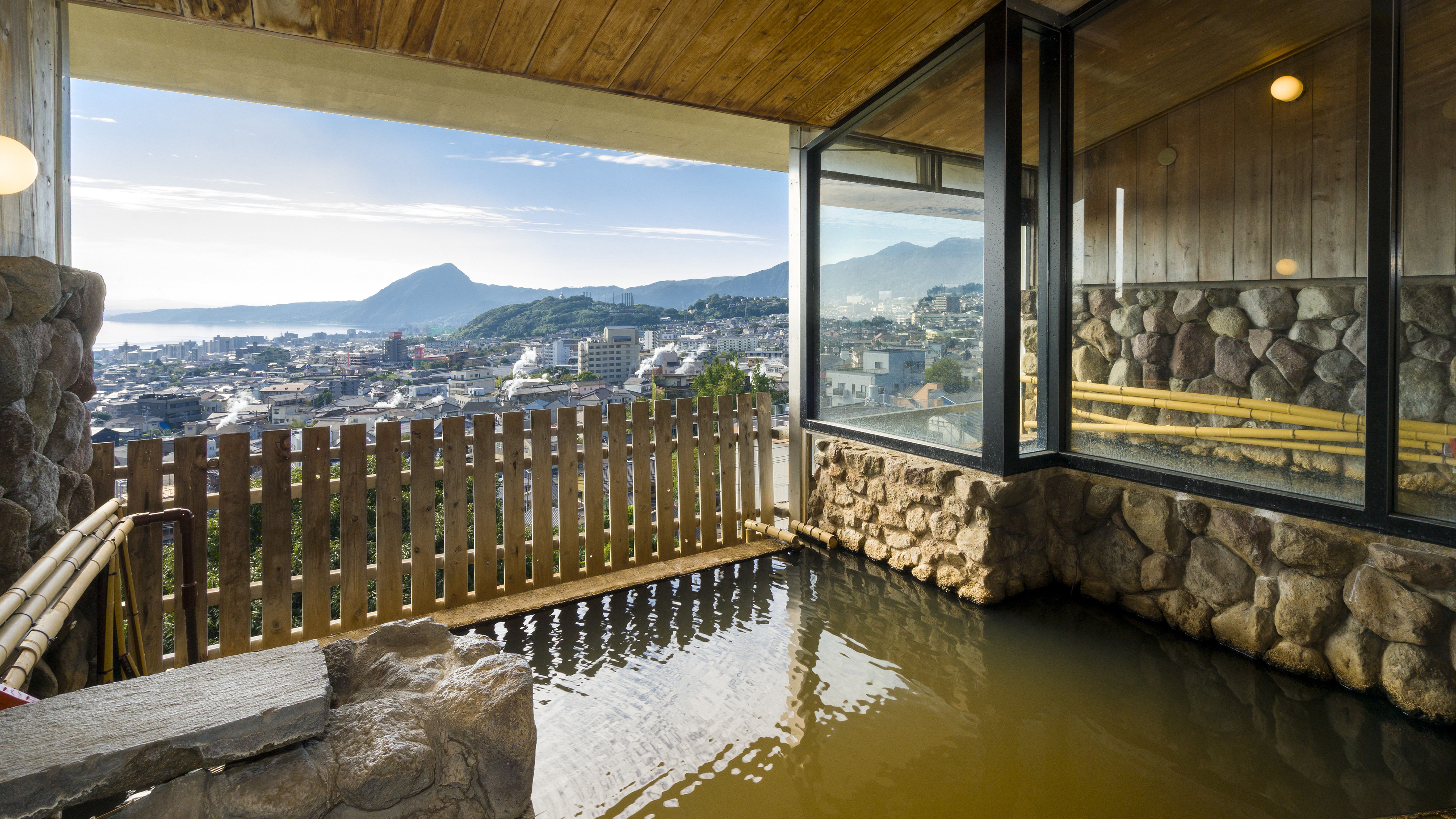 男女別展望風呂。別府の夜景を一望できる展望風呂。内湯と半露天の他に、サウナも完備。日帰りプランは、お食事処の個室にて、おおいた和牛ステーキ会席に舌鼓!