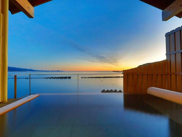 本館屋上階には4つの展望貸切露天風呂があって、全て無料で24時間利用可能。眼下には相模湾を眺めることができ、初島付近からの日の出は絶景。全部で7つある貸切風呂は予約不要で、滞在中何度でも利用可能。宿自慢のお舟盛り付きの磯料理がおすすめです。