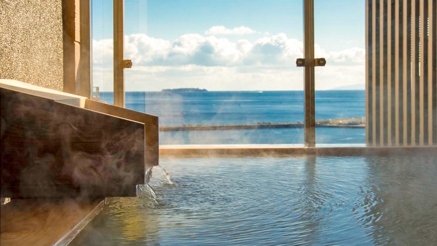 熱海の高台に佇み、花火鑑賞も叶う絶景自慢のナチュラルリゾート。大浴場に引泉している温泉は塩化物・硫酸塩泉で、湯あたりがとても柔らかく、美肌効果もあります。女性にはセルフエステがお愉しみいただける、専用パウダールームや岩盤浴もあります。男湯にはサウナが完備。