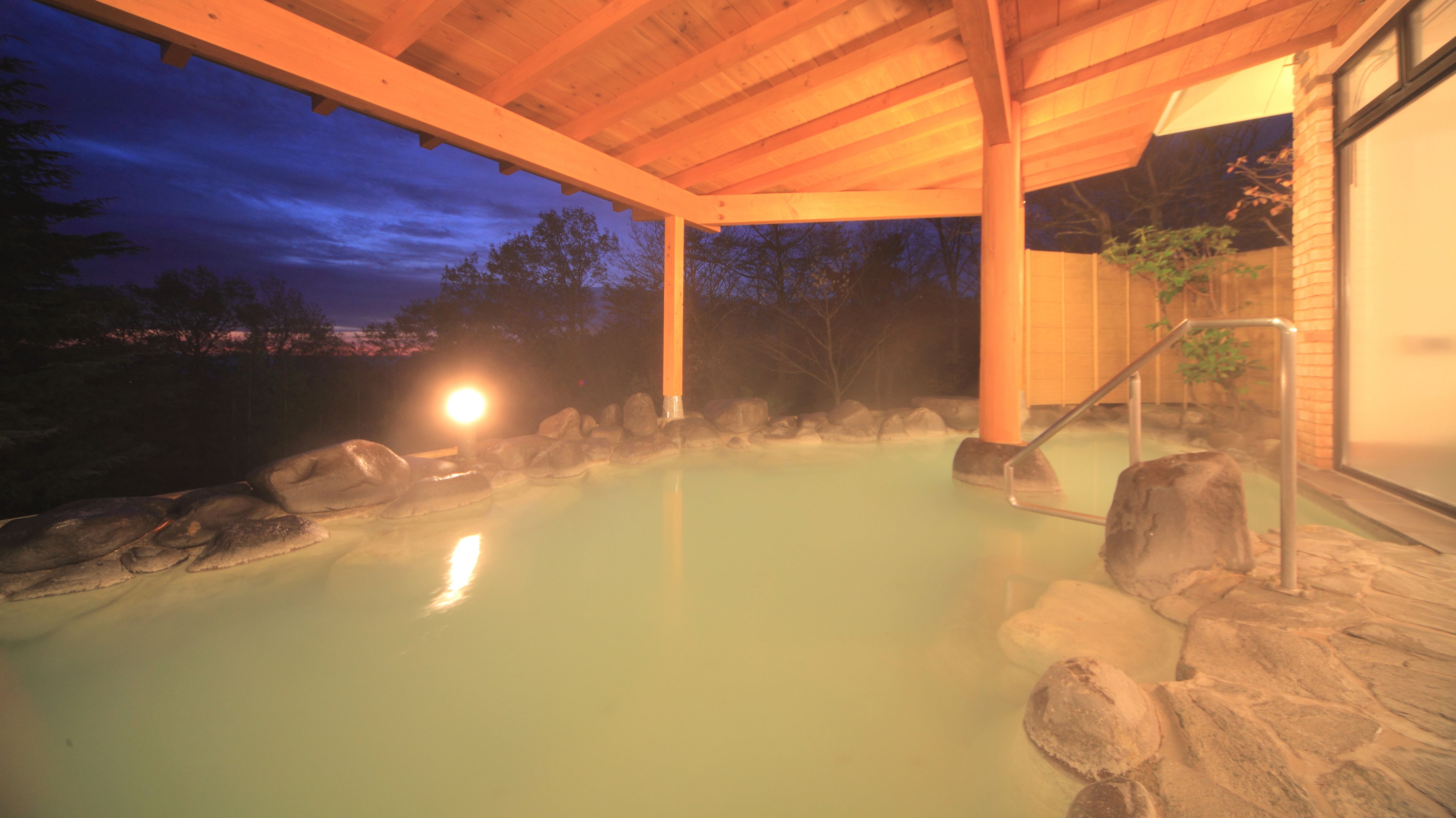 露天風呂は湯治にも用いられる、鹿の湯を源泉とする、 掛け流しの本格天然硫黄泉です。 白く濁り少しとろみのある酸性含硫黄泉は、様々な健康増進効果が期待できます。 入浴後のお肌はしっとりと滑らかで美肌効果も期待できます。