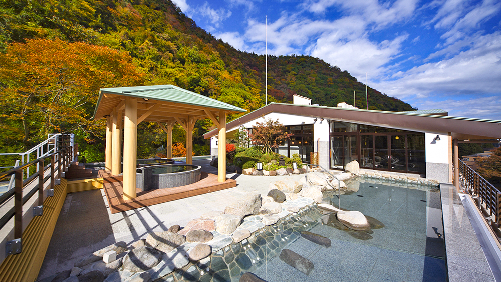 最上階にある展望露天風呂からは、箱根の山々を見渡すことができます。泉質は、塩化物泉の別名「温まりの湯」又アルカリ度が高く、美容目的で使用されるメタ珪酸を多く含む「美肌の湯」です。日帰りプランは源泉100%の部屋風呂付、会席料理がセットになったプランです。