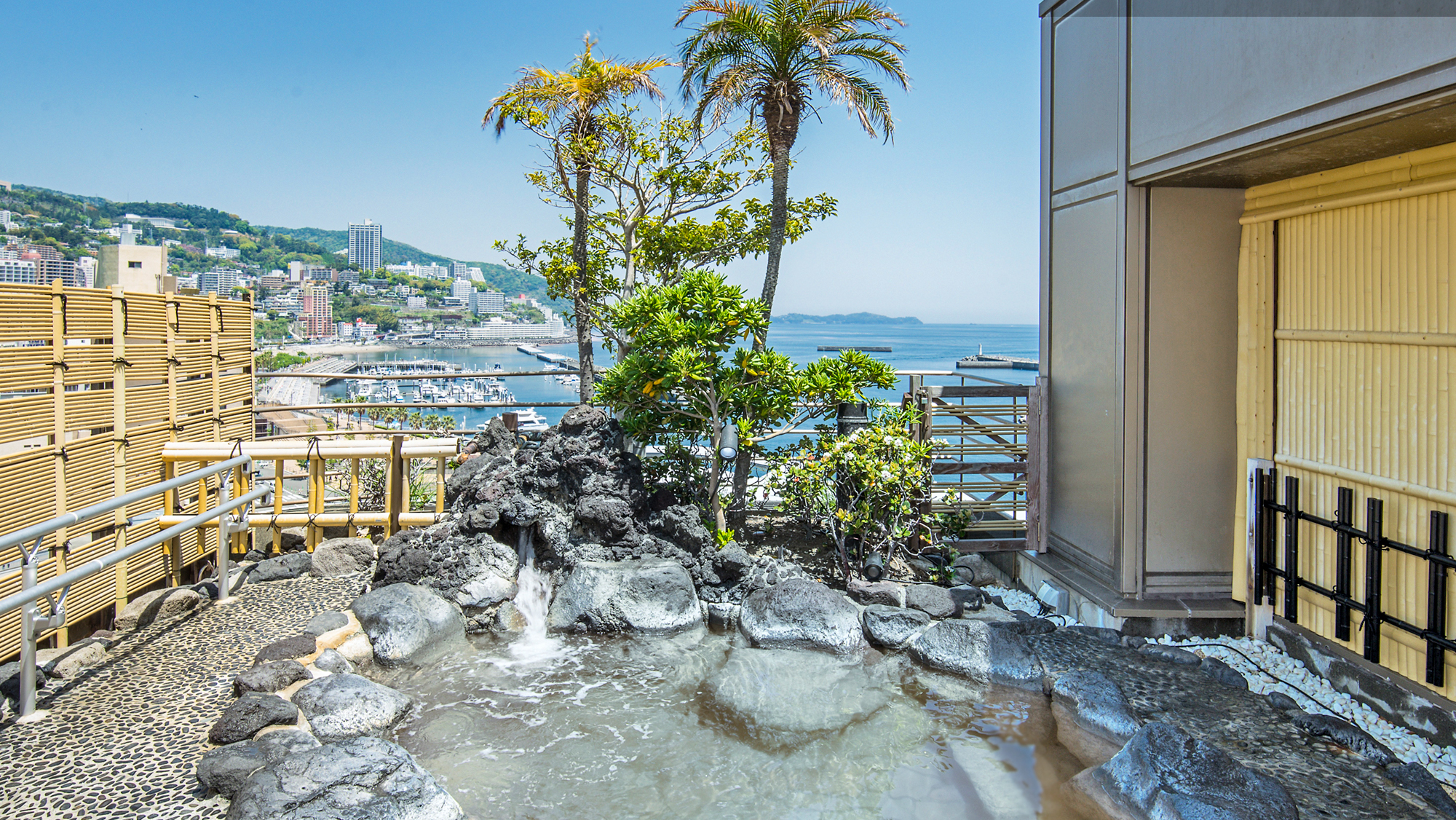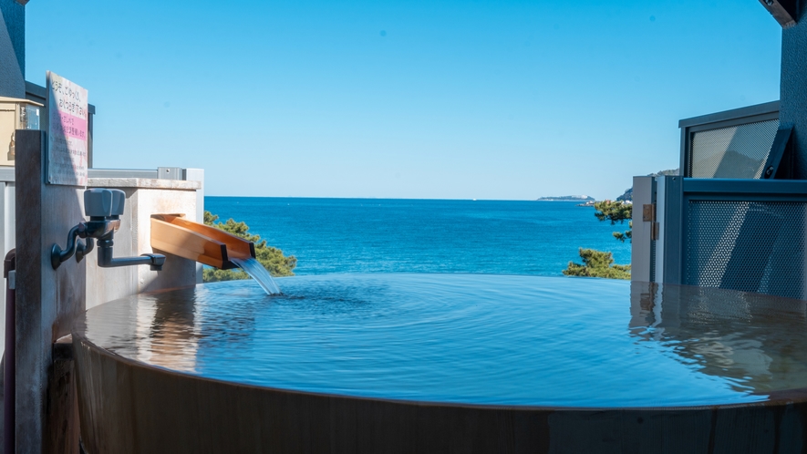 ・本館屋上階には4つの展望貸切露天風呂があって、全て無料で24時間利用可能。眼下には相模湾を眺めることができ、初島付近からの日の出は絶景。